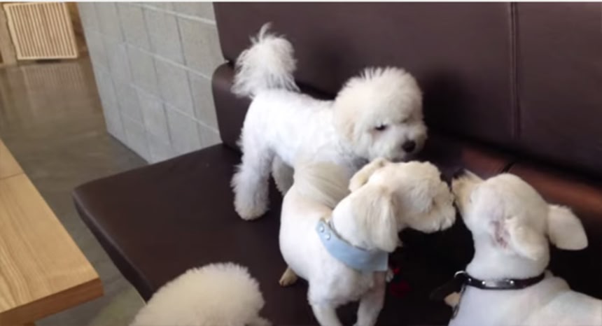 マルチ?と大きめの子が喧嘩しているところにビション2匹が宥めに来たかんじ。