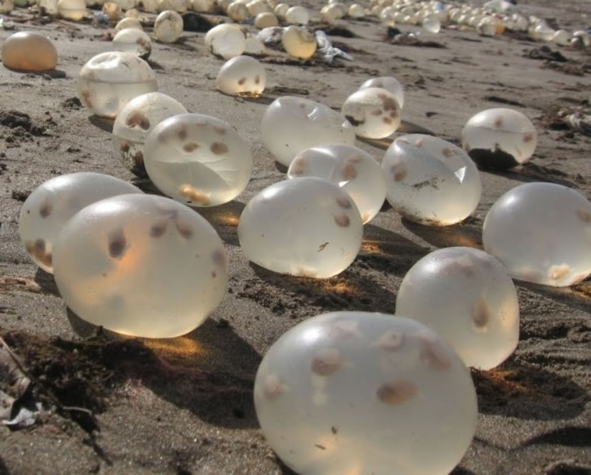 この画像を大きなサイズで見るなんかこれに似たやつ、どっかで見たことあると思ったら、生卵と酢で作るボールだった。(関連記事)それにしてもこんなのが海岸にゴロゴロ転がっていたらちょっとわくわくしちゃう。