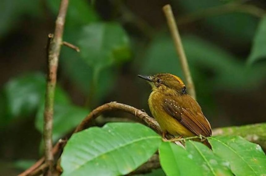 この画像を大きなサイズで見るオウギタイランチョウは冠羽を頭部にしまっておくことができ、名前のとおり扇形の冠羽を、力を誇示したいときあるいは攻撃したいときにだけ現す。冠羽の色はオスが赤でメスがオレンジ色である。この鮮やかな色形は、一度見たらなかなか忘れられない。