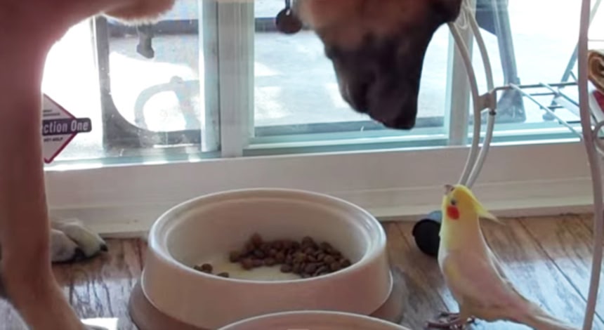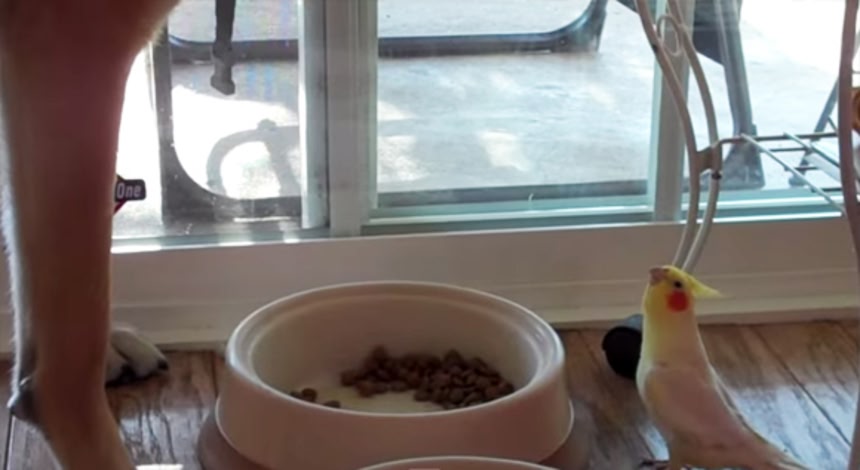 オカメインコのロージーさん、犬のバートさんが食事している間ずっと目の前で歌のプレゼント。これはバートさんにとってうれしいプレゼントなのかどうなのかはちょとよくわからない。