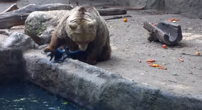 この画像を大きなサイズで見るハンガリーの首都ブダペストにある動物園で軌跡の光景が目撃された。クマのブース内に設置された池の岩の上に置いてある餌を食べようとそこにやってきたヒグマは、岩陰で弱り果てているカラスの存在に気が付いた。