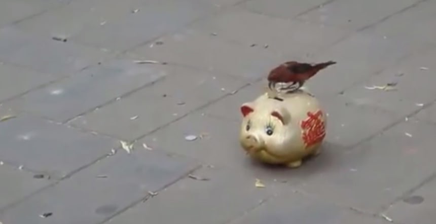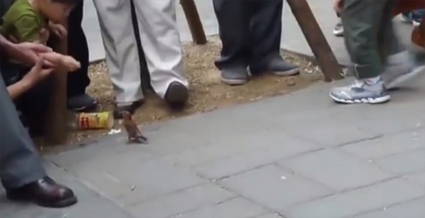 中国でのストリートパフォーマンス映像なのだが、訓練された小鳥2羽が民衆から小銭を回収し、貯金箱の中に入れるという作業を行っている。小鳥たちがチャリンと小銭を貯金箱に入れるところ見たさに、集まった人々はどんどん小銭を与えるわけだが、いろんな商売があるものだ。