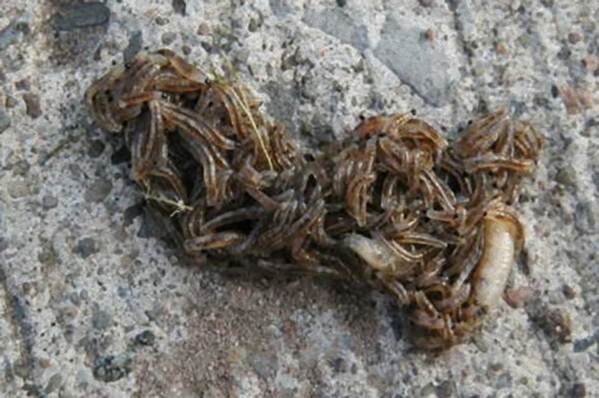 このウネウネした塊は、無数のクロバネキノコバエの幼虫が編隊を成して移動しているところをとらえたものだ。キノコバエの幼虫たちは群れで移動することで、捕食者から身を守っているのだそうだが、こんな場面を目撃してしまった人間に対するダメージは考えていなかったようだ。大打撃である。