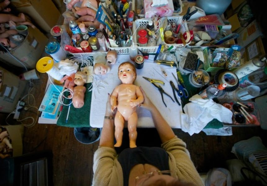 この画像を大きなサイズで見るこのドールホスピタルの”頭部外科医”、ジェフ・チャップマンさん。彼の仕事場にて