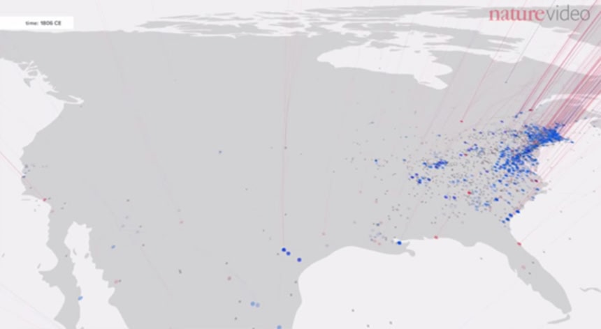 この画像を大きなサイズで見るこの頃になると、ヨーロッパの各地から成長の著しいアメリカの都市へ移住する人口が一気に増加する。ボストン、ニューヨーク、ワシントンを見ると誕生を示す青い点より死亡を示す赤い点の方が圧倒的に多いことに気付く。しかし、移動はまた始まる。青い点を見ると、人の流れが川沿いにそって移動しているのが分かる。