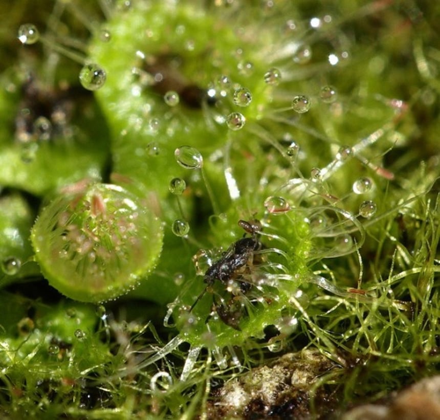 194以上の種類を有するモウセンゴケ属は、おいしいごはんを思い浮かべながら、その葉に粘液を散りばめて待ちかまえている。