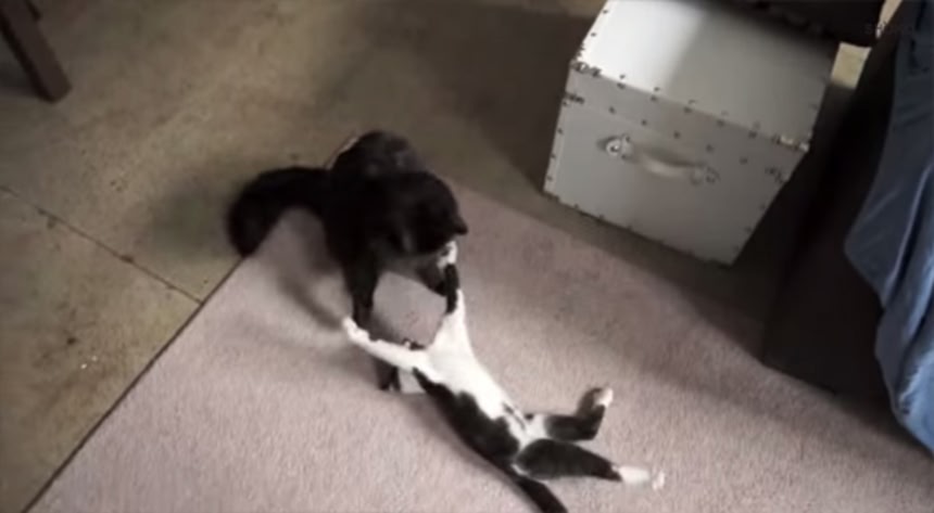 新参子猫の背後からそっと忍び寄る古参猫→ビックリして跳躍力MAXな子猫…ワロタ(≧∇≦)