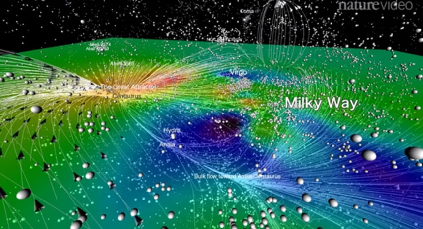 この画像を大きなサイズで見る銀河には、宇宙の膨張による外向きの力が作用している。しかし、重力もまた存在し、それぞれの銀河を引き寄せている。タリー氏が率いる研究チームはこの原理を使い、銀河系と銀河がどの重力源に支配されているかを調べた。