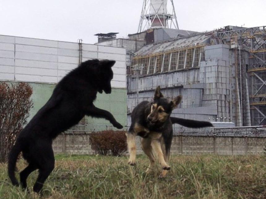 この画像を大きなサイズで見るチェルノブイリ事故現場の目の前で遊びまわる野良犬。猫と同様に彼等もまた、人間の手が加えられなくなった土地でのびのびと暮らしているのだ。