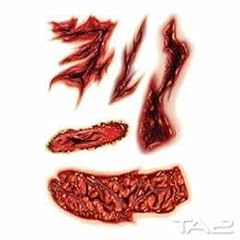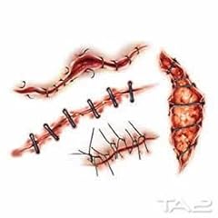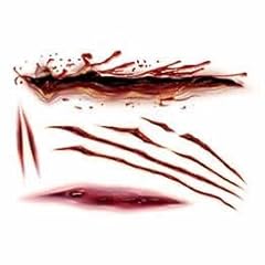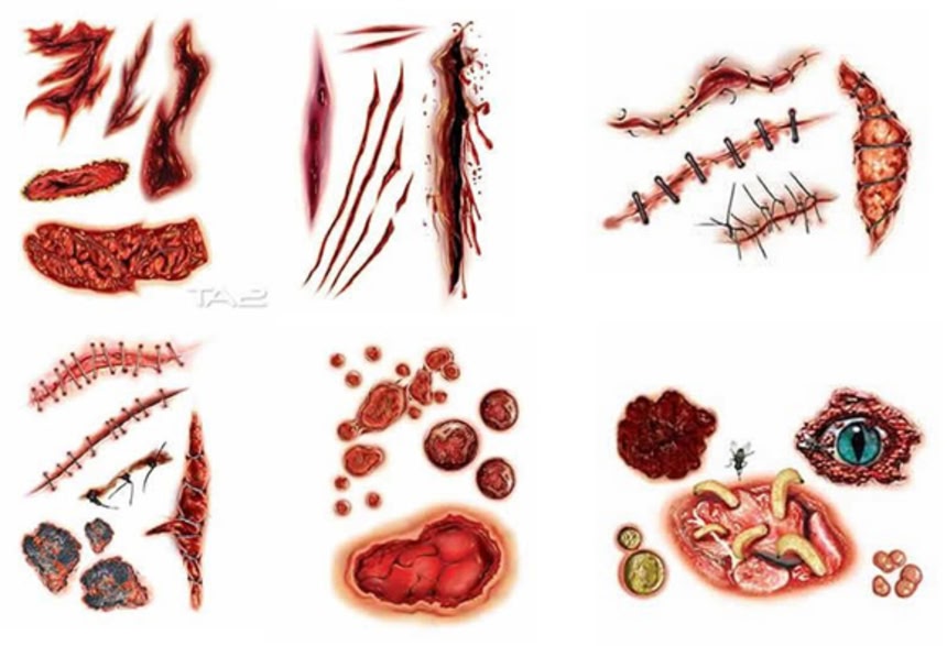 ひっかき傷であったりかさぶただったり、火傷の跡だったり縫合後であったり、ウジが湧いていたりと、アマゾンでは500円程度で様々なタイプのステッカーが販売されている。