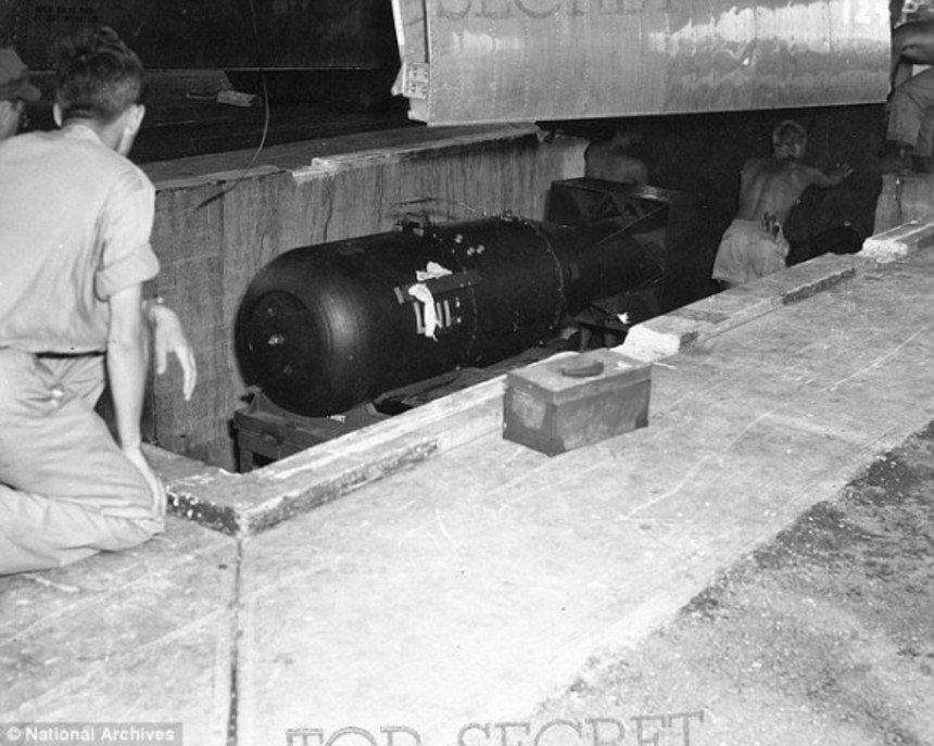 この画像を大きなサイズで見る手作業で格納ピットへ収納される原爆。作業員には上半身裸の者もいる