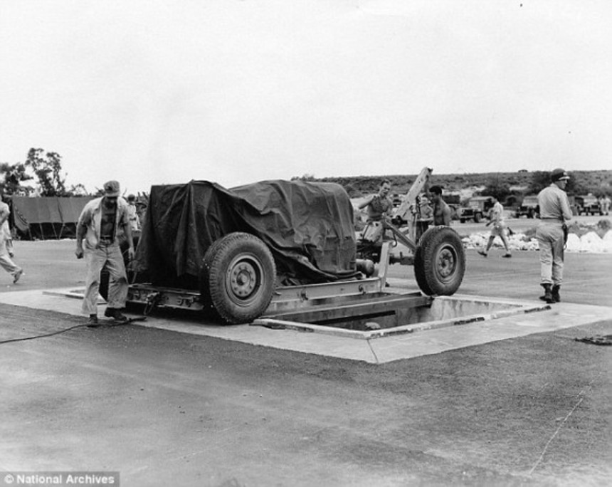 この画像を大きなサイズで見るピットに格納された原爆。作業員は安全対策としてカバーをかけている