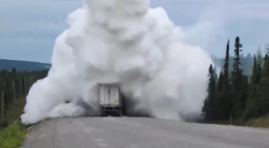 この飛行機のパイロットがテクニックを駆使し、炎上しかかっているトラック目がけて上空から消火用気体を噴射。1発で命中!ナイスコントロールだ。