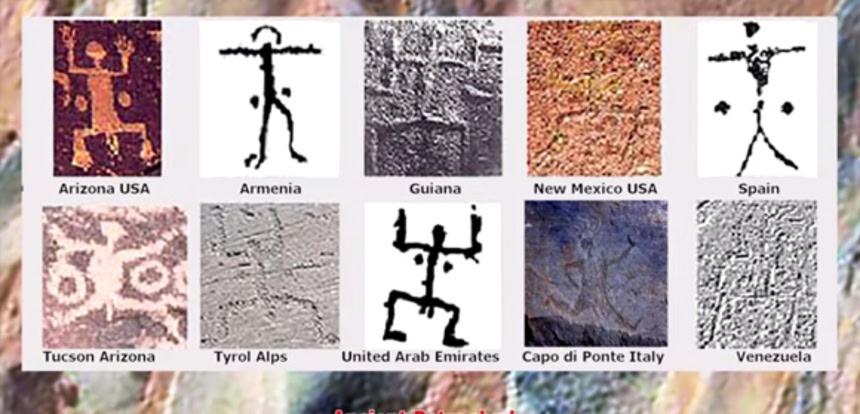 この画像を大きなサイズで見る地球上にあるペトログリフの最も古いものはウクライナの「カメンナヤ・モグリャ」にあるもので、旧石器時代(約10,000から12,000年前)のものといわれている。南極大陸をのぞく世界中のいたるところで発見されており、GPSで記録されたペトログリフを分析した結果、紀元前3000年から7000年頃のペトログラフに、大陸の全域の広い範囲で共通性がある事が分かっている。