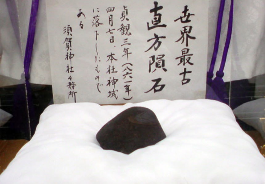 ちなみに日本の場合には、国土が狭いため国内に落下が確認された隕石の数はそれほど多くない。隕石と認定されたものは50個ほどで、最古のものは、861年5月19日(貞観3年4月7日)に福岡県直方市に落下し、須賀神社に保存されている直方隕石 (0.472kg) である。これは、落下記録が残っている隕石で、現存するものとしては世界最古のものだそうだ。