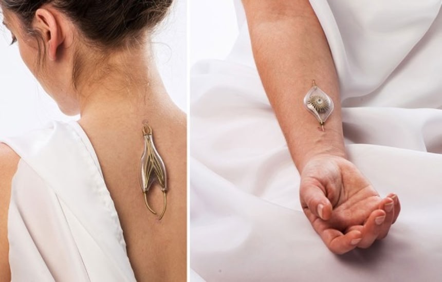 イスラエルの大学院生、ナオミ・キシュナーが奇妙なアクセサリーを作り上げた。常にスマホや携帯機器のバッテリーの充電を心配している若者たちを揶揄したもので、人体に3つのアクセサリーをはめ込んだり、針で埋め込んで、血液から機械的に自分を動かすように見立てたもので、本体である自分自身の充電器具のようなものだ。