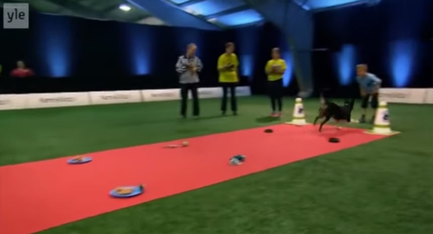 海外の競技で、おいしい餌や楽しそうなおもちゃなどが設置された道を駆け抜け、いち早く飼い主にたどり着いた犬が勝つというコンテストがフィンランドで行われていた。