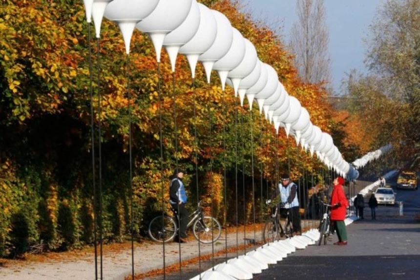 2014年:統一されたベルリンの住民が壁の崩壊を記念して、壁があった場所に沿って光る風船を飾った。