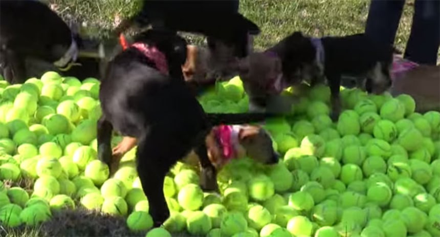 この画像を大きなサイズで見る大量のボールがトラックから流れ出し、嬉しそうにはしゃぐ犬たち