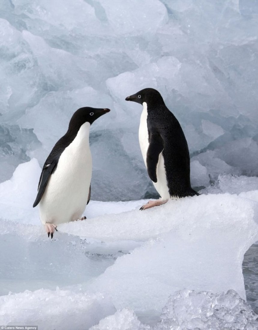 この画像を大きなサイズで見る3.「こっちへおいで」とばかりに凍てつく海ではしゃぐ2匹。アデリーペンギンの恋模様を撮影したのは、氷河を写真に収めるために南極半島へ旅に出たアダム・ギブズ氏だ。
