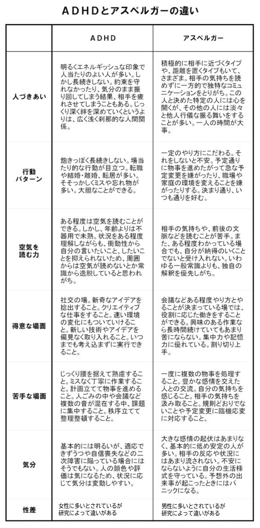 あとコメント欄を読んで、ADHDとアスペルガー症候群(ASD:現在は高機能自閉症に分類されている)を混同している人がいるようなので、その違いを分かりやすく表したものがあるので、補足しておくことにする。