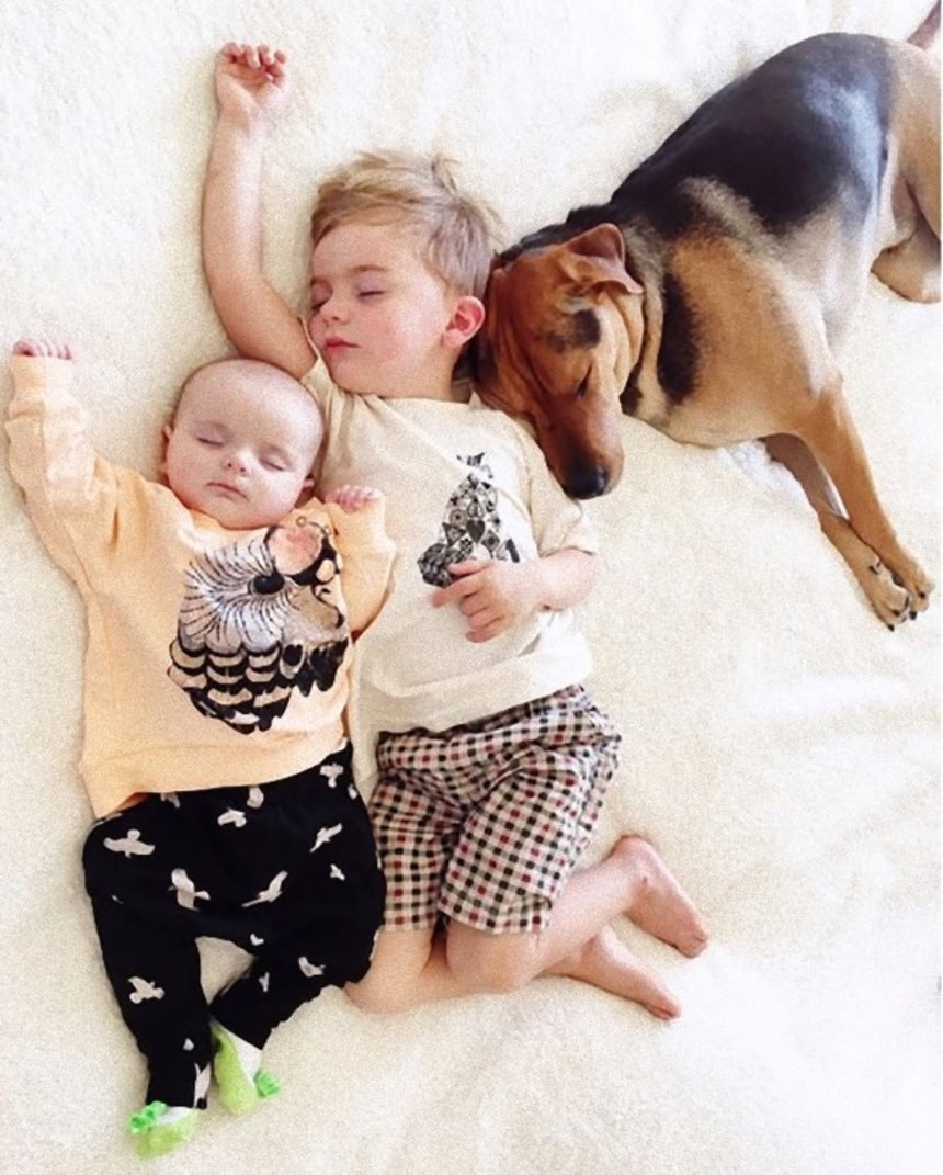 この画像を大きなサイズで見る2013年、カラパイアで紹介した、仲良く眠る犬と少年のお話だが(関連記事)、なんとそこに生まれたばかりの妹が加わったようだ。
