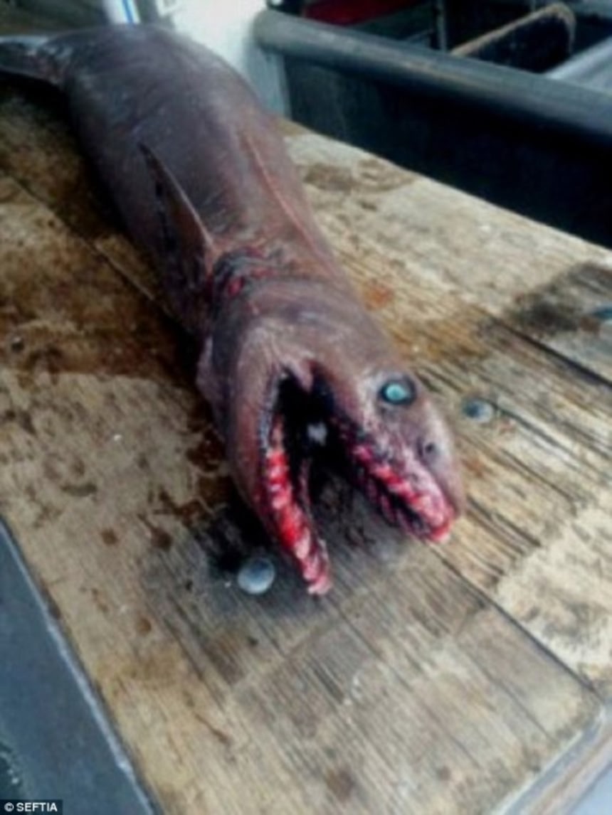 この画像を大きなサイズで見るラブカは、8000万年前もの太古から存在していたといわれている。ラブカ科の現生種は2種のみ。南東トロール漁協会のサイモン・ボーグ氏によれば、捕獲した漁師は25列、合計300本もの歯が生えたこの魚に大変困惑していたという。