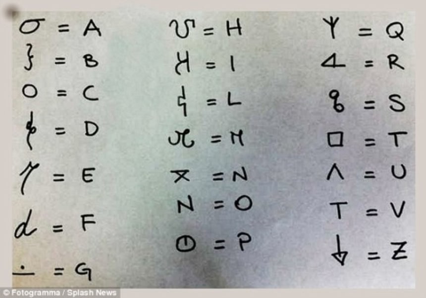 この画像を大きなサイズで見るこの解読コードのおかげで、マフィアの使用していたヒエログリフの解読を可能にした。ンドランゲタはアルファベット一文字一文字にそれぞれ「サン・ルカコード」と言われる文字を代わりに当てることで、暗号を作っていたのだ。