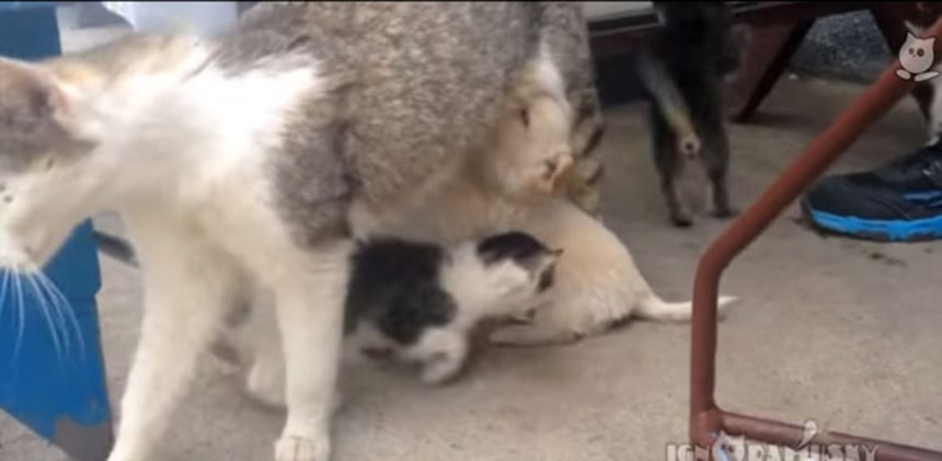 たくさんの子猫を生んだ猫おかあさん。いつでもどこでも、次から次へと、子猫たちにミルクをねだられるわけなんだけど、その中にひときわクレクレしている個体がいた。良く見ると毛色が違うし、ちょっと大きいし。
