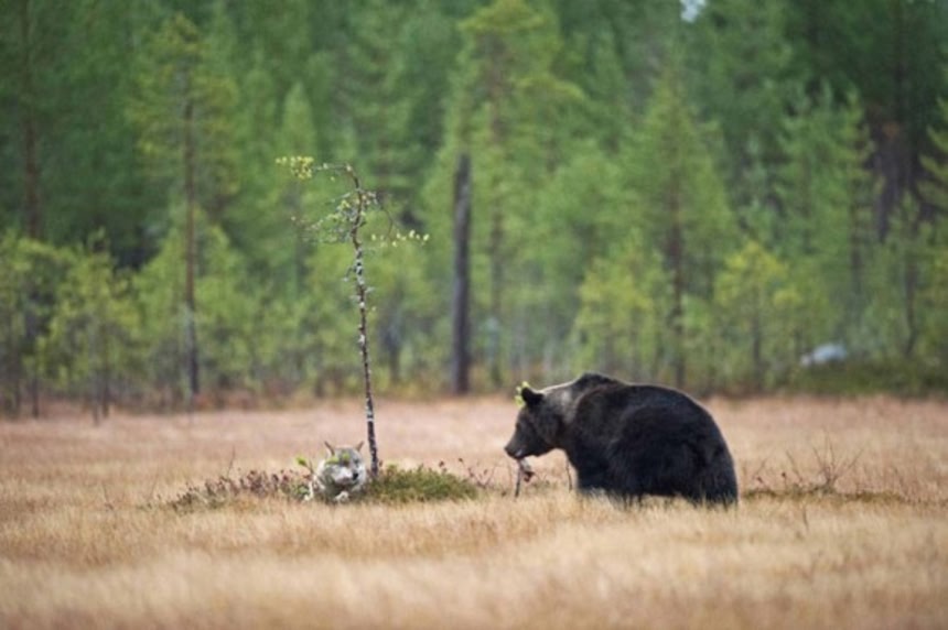 この画像を大きなサイズで見るフィンランド北部の荒野で野生動物写真家のラッシー・ラウティアイネン(56)は奇跡の光景を目の当たりにした。若いオスのヒグマと、若いメスのハイイロオオカミが、お互いに分け合いながら夕食を食べあっていたのだ。