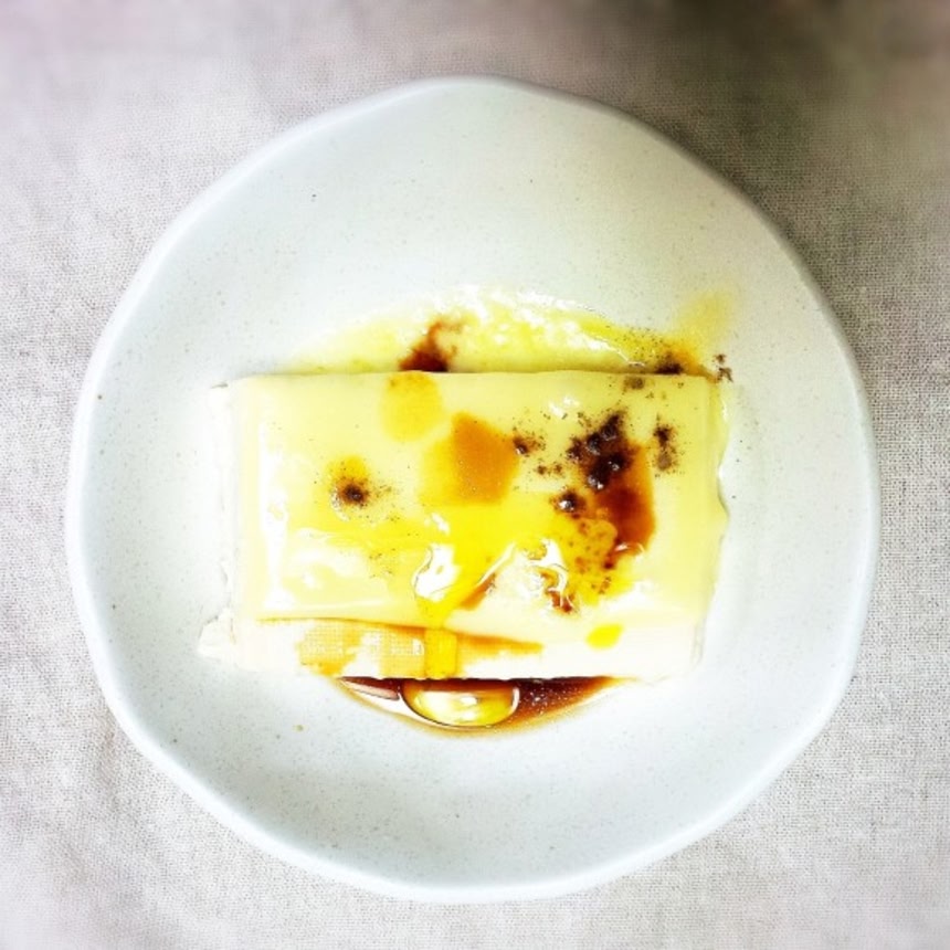 この画像を大きなサイズで見る水切りをした豆腐にスライスチーズを乗せレンジで1分くらい。出来上がりに、塩・胡椒・醤油、お好みでオリーブオイルをかけたらはい、できあがり!