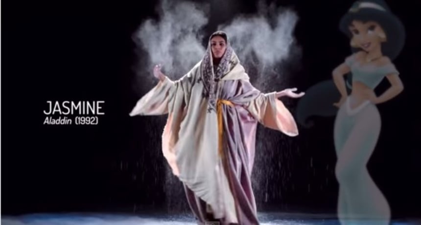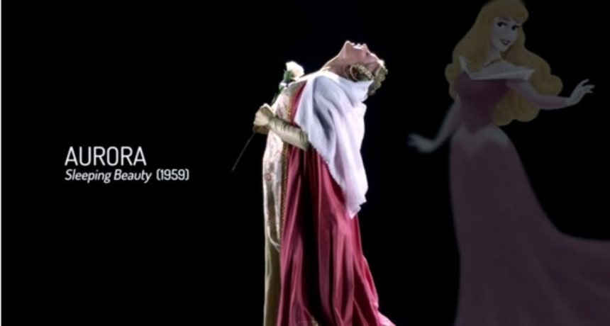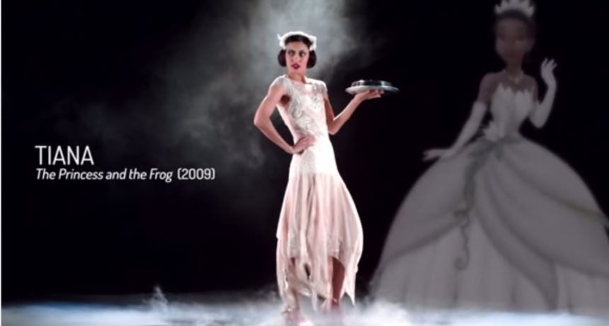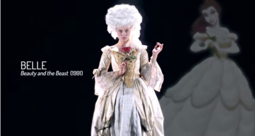 この映像は、6人のディズニープリンセスたちの設定上の生きていた時代背景をもとに、当時の女性の衣装を再現したものだ。