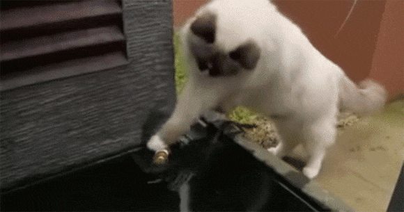この画像を大きなサイズで見る水槽の排水溝のようなところに引っかかってしまった1匹の魚。クマノミかな?それを発見したのは1匹の猫。猫の習性を考えると、この後すぐ!ってことになるわけなのだが、実際にこの後すぐに起きた出来事は我々の想像の2周くらい上回っていた。