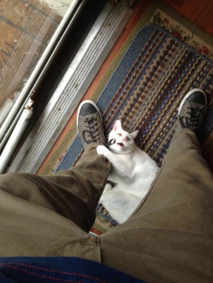 出かけよとすると下僕の足元にスリスリして衣類に猫毛を付着させ
