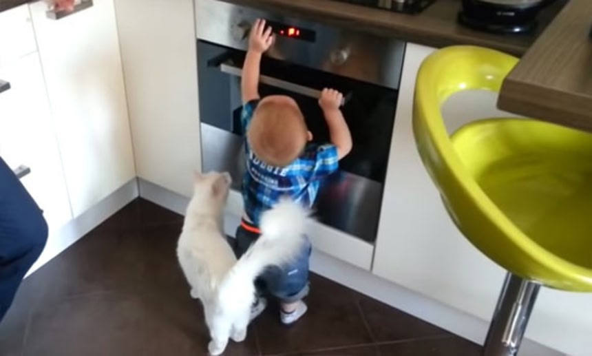 小さな子どもが台所のオーブンに興味を持った。その様子を心配そうに見ているのは白猫さん。子どもはオーブンのスイッチを押し始めている。子どものまわりをうろちょろしながら見守っていた白猫さんだが、「あ、まずい!」そう判断したのだろう。すっと立ち上がり、子どもの腕をオーブンから引き離したのだ。