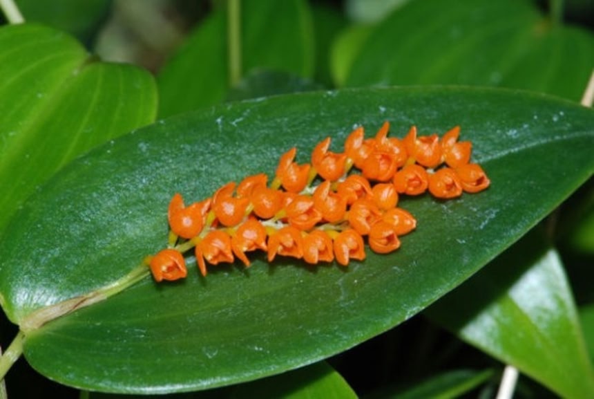 この画像を大きなサイズで見るまるで水平に咲くオレンジ色のスズランのように見えるが、実際はランの一種。プレウロタリス属で、小さな花が赤ちゃんのボンネットに似ていることから、ボンネット・オーキッドと呼ばれることもある。低木を覆ったり、上に高く伸びたり、群生したり、地面をはったりと、さまざまな成長の仕方がある。通常のランと違って、低温を好み、湿気を嫌い、高地でもっともよく育つ。