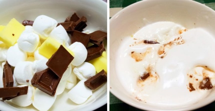 1.耐熱ボウルに手でちぎったマシュマロ、バター、チョコレートを入れて