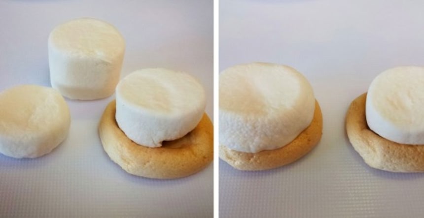 4.粗熱が取れたクッキーにマシュマロをキッチンバサミで半分にカットしたものを貼りけるようにしっかりのせ、電子レンジで30秒(500wの場合)加熱する。