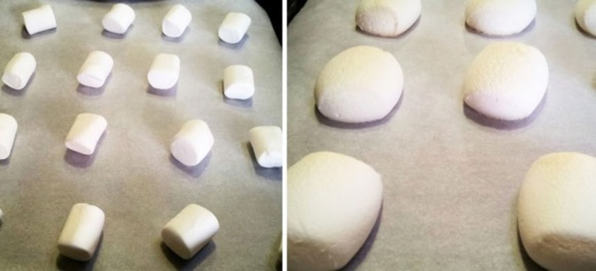 1.天板にオーブンシートひき、間隔をあけてマシュマロを置く。130度で5分くらい温める。