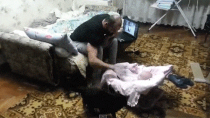 おそらくはロシアからの映像だが、父親が赤ちゃんを怒鳴りつけ、打つふりをしていたところ、猫がすっ飛んできて、父親の手を制するよう止めに入ったのだ。