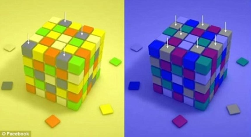 同じことが黄色い背景に青いタイルを並べたものと、青い背景に黄色いタイルを並べたルービック・キューブでも実演される。