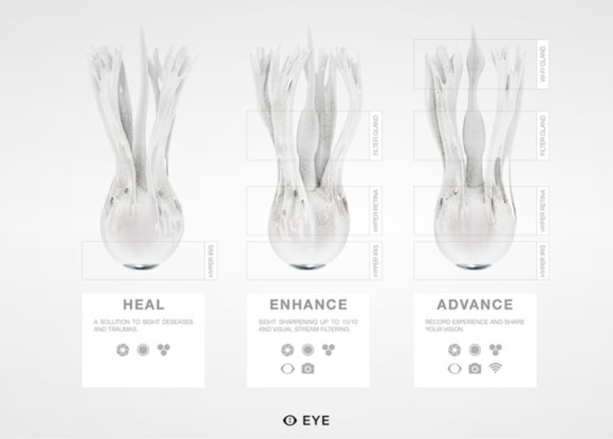 この画像を大きなサイズで見るナセッティ氏の構想では、利用者は”ヒール”、”エンハンス”、”アドバンス”の3種類の合成EYEから好きなものを選ぶことができる。