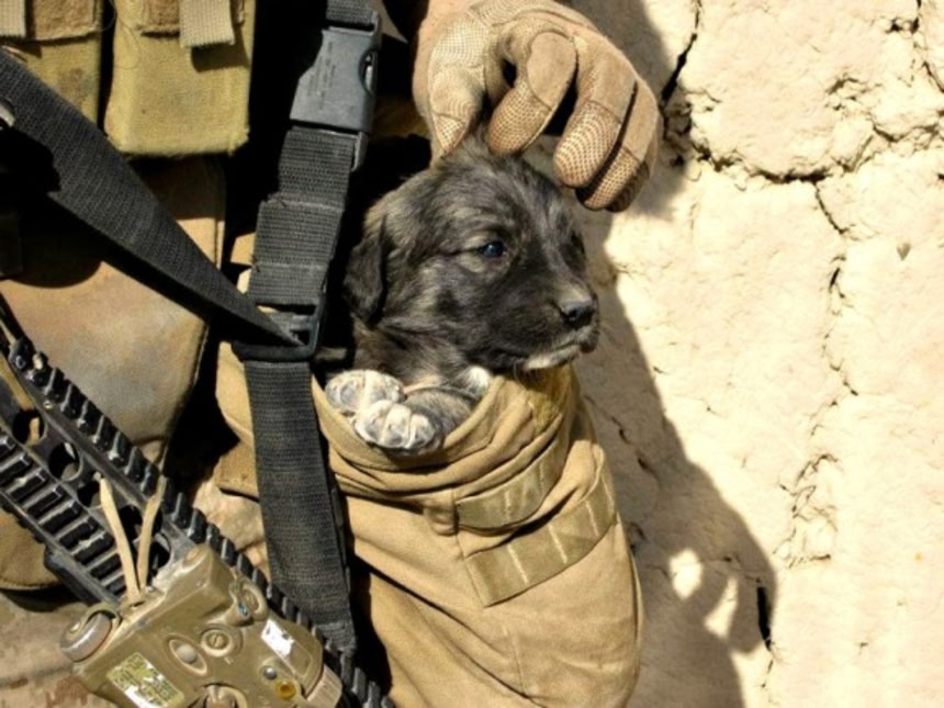 この画像を大きなサイズで見る研究によれば、犬などの動物と時間を過ごすことで、”愛のホルモン”として知られるオキシトシンが放出され、ストレスを軽減することができる。従軍中の兵士には大きな利点があるだろう。兵士のポケットを満喫中のチャブズというこの子犬もまた、ガズニーで警戒にあたるこの兵士を癒していることだろう。