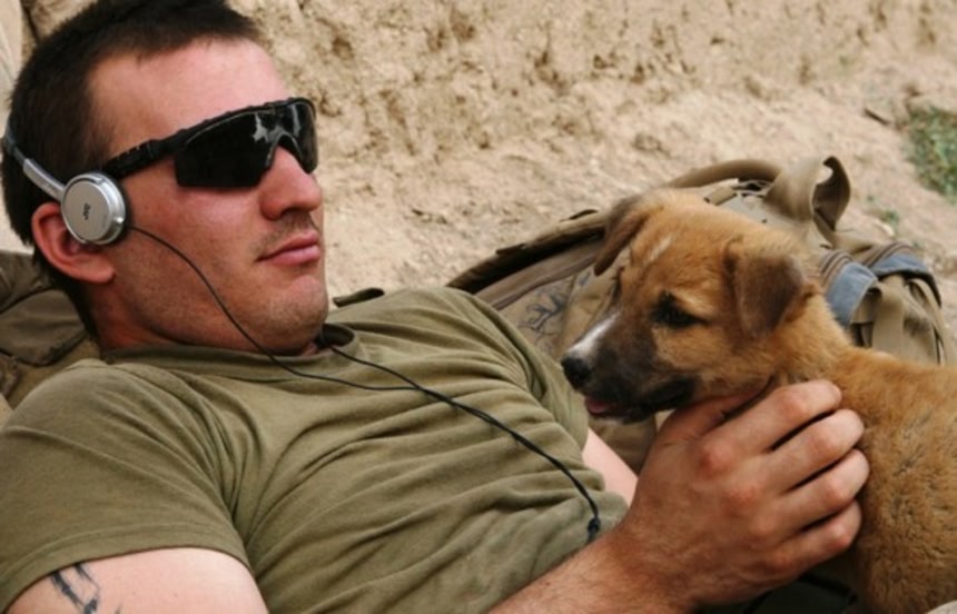 この画像を大きなサイズで見る2010年5月の2日間シフトの合間に、マルジャで子犬と一緒にロックンロールを楽しむジェームズ・R・ボージリエリ兵長。海兵隊の第6連隊に所属する彼が、同伴者を歓迎している様子が伝わってくる。