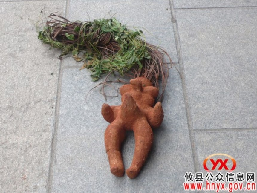 この人型植物(タデ科の植物ツルドクダミ)は、中国江西省萍郷市蘆渓県で鄭さん(64歳)が自宅付近の山で掘り起こしたものだそうだ。