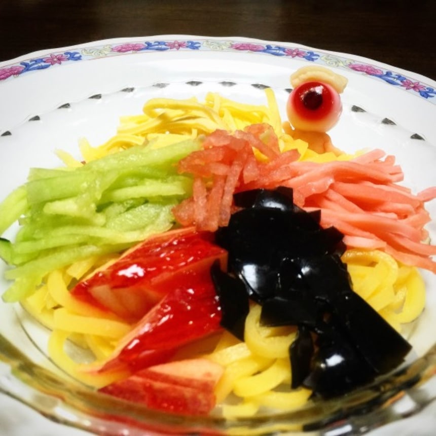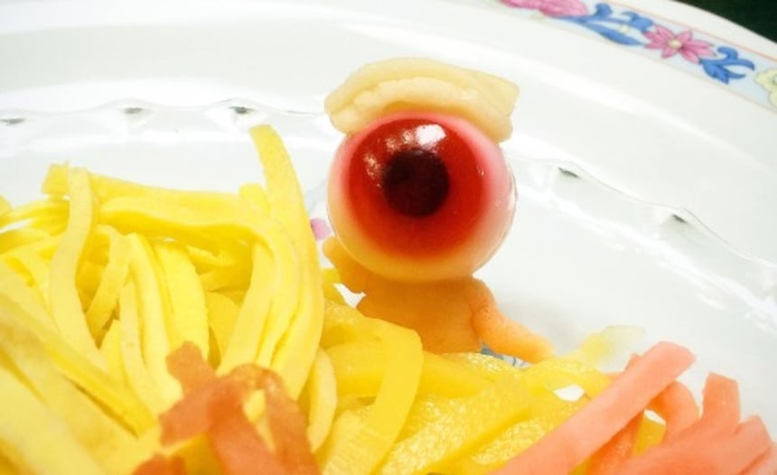 この画像を大きなサイズで見るということで、冷やし中華フェイク自体がオチなので、さらにオチっていうのもなかなかアレなのだが、フードクリーチャーアーティスト、別名目玉職人のクマ姉さんにそこを何とかお願いした所こうなった。