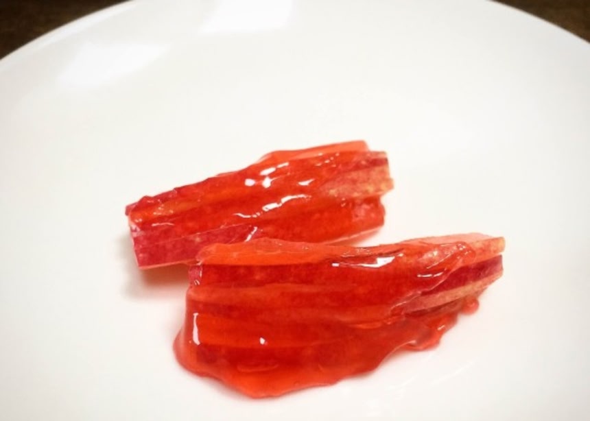 2㎜幅くらいにスライスしたリンゴを約5枚分重ねておき、鍋に水とアガー(ゼラチン)、食用色素を入れて沸騰させる。熱したアガーをリンゴの皮部分にかけ、冷蔵庫で5分くらい冷やしたら出来上がり。アガー(ゼラチン)はつやを出す為に使用するので、なければイチゴジャムなどをリンゴの皮に塗ればOK。