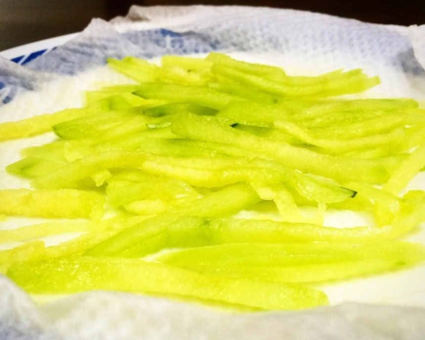 緑色のメロンを薄くスライスし、千切りにしたらキッチンタオルの上に置き、水分をとっておく。皮に近い方がきゅうり感がでるが、甘くないので砂糖をまぶしておくとよい。