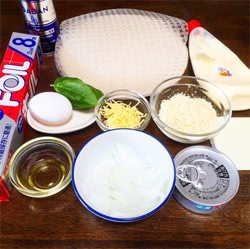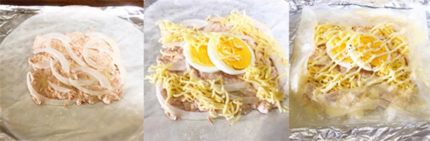 この画像を大きなサイズで見るさらにツナ缶半分とマヨネーズ大さじ1杯を混ぜた具を中央に乗せる。位置はペーパーの下から透けて見えるスライスチーズの位置を目安にしよう。その上にスライスした玉ねぎ、ゆで卵を乗せ、ピザ用チーズ、マヨネーズ、黒こしょう、パルメザンチーズをかける。具材を乗せ終わったらライスペーパーを4方向から正方形になるようにたたむ。