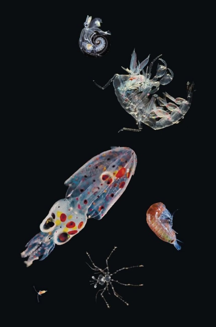 この画像を大きなサイズで見る科学者たちは、光を発するイカや微細な動物プランクトンまで、海の浅瀬に届く日光の中にいる、さまざまな奇怪な生物たちについてまとめた。写真は、甲殻カイアシ類、クモガニ類の幼生、端脚類、イカの幼生、ヨコエビ類、軟体翼足類。